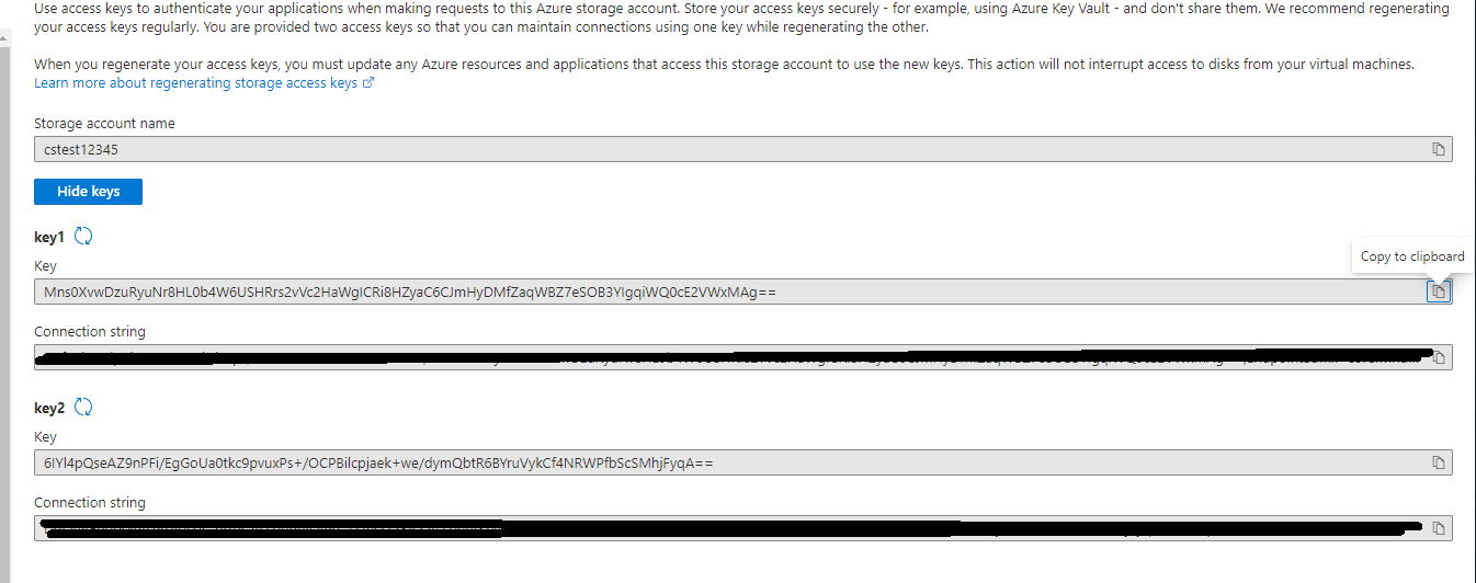 - Navigate to the Access Keys blade and make note of the storage account name and the Access Keys.