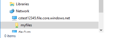 - On the Windows VM, open a command prompt and use Net Use to mount the file storage object. The Azure format is 'objectname'.file.core.windows.net