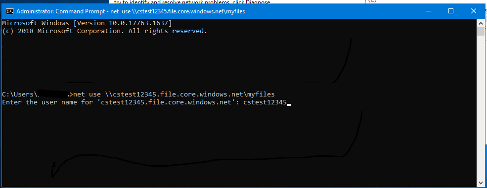 - Issue NET USE \\<objectname>.file.core.windows.net\<sharename>
