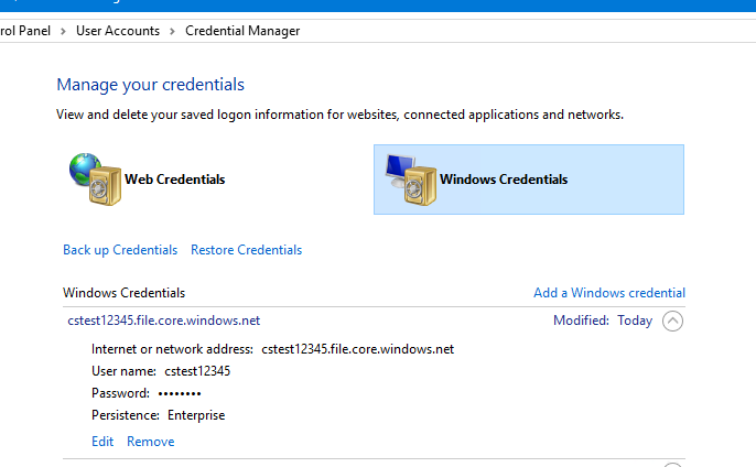 - The next step is to persist these credentials in the Windows Credentials Manager to ensure that the Titan Service will have access to the UNC share. To do this, run Windows Credential Manager from the Start Menu