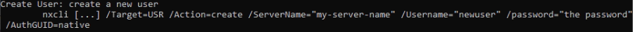 nxcli [...] /Target=USR /Action=create /ServerName="my-server-name" /Username="newuser" /password="the password" /AuthGUID=native