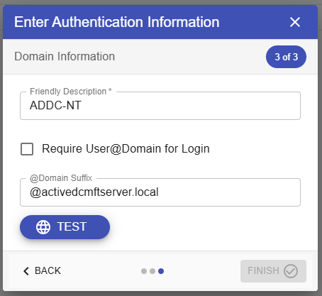 - Add some Friendly name and check Require User if you want to use domain suffix for login. Then test the connection. If succeed you can now click the Finish.