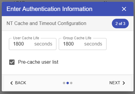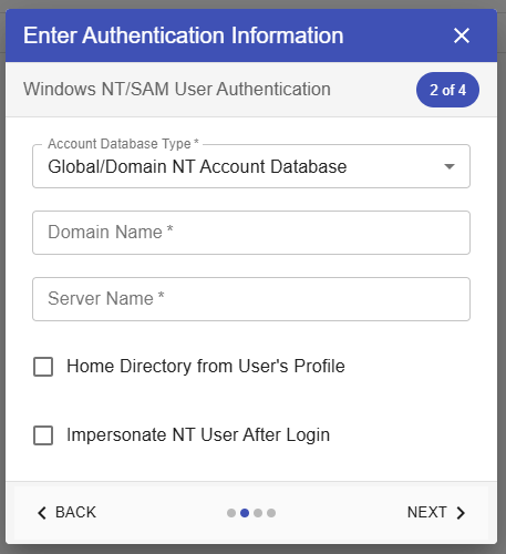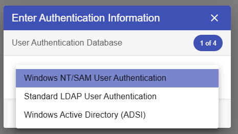 - In pop up form. Select Windows NT/SAM User Authentication in the dropdown then click next.