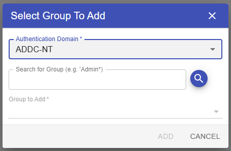 - In the pop up. Select LDAP in Authentication Domain dropdown. Put your NT/SAM group name in the field and click Search Groups. Then select the group you want to add in next dropdown. Then click ADD.