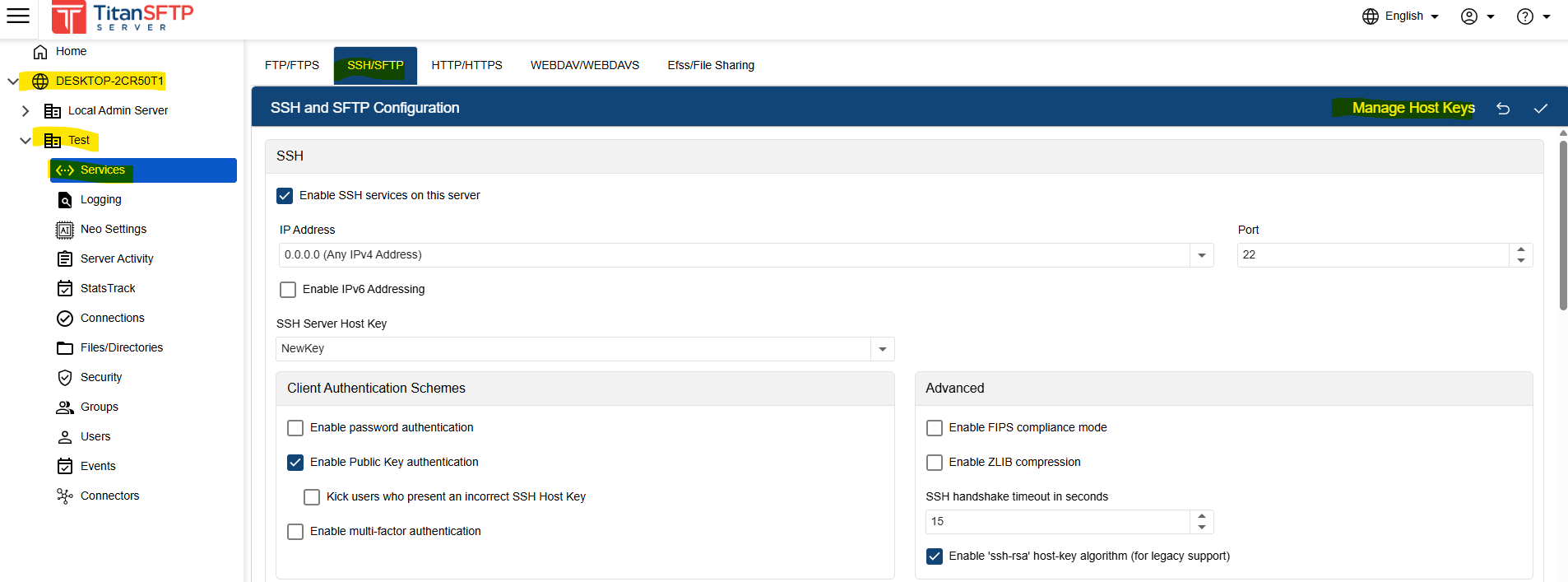 - Select the New Key Name from the SSH Server Host Key dropdown.