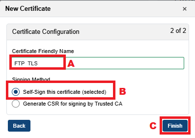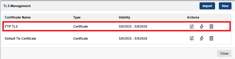 - After Click Finish, newly create TLS certificate will be added in the list. Click Close