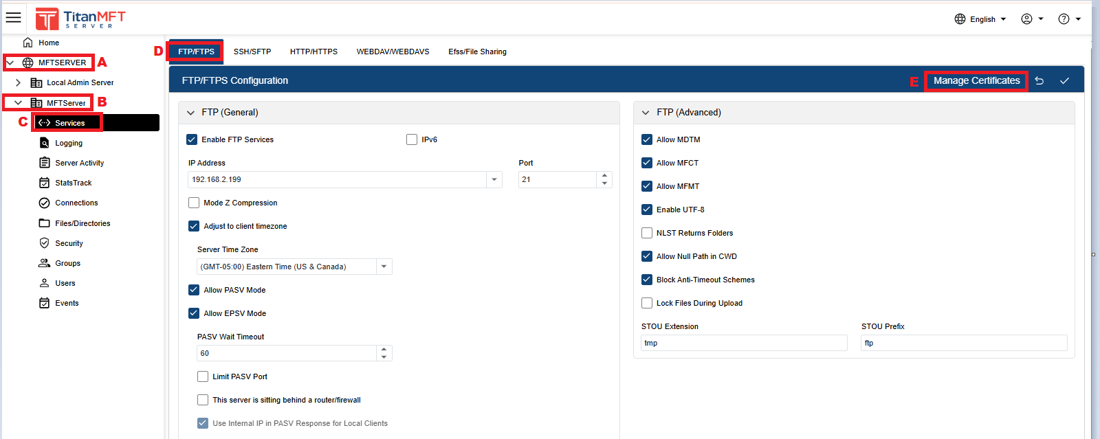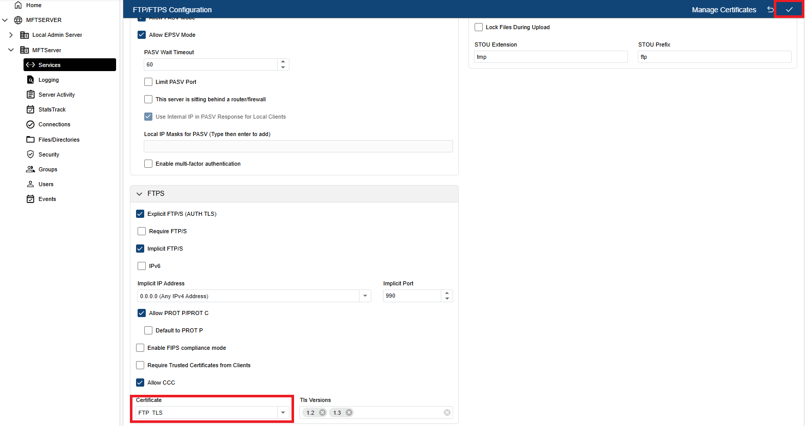 - Scroll down to the bottom of the FTP/FTPS page and select newly created certificate then click Apply.