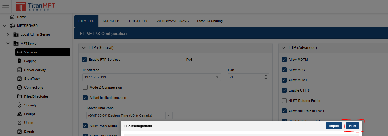 Creating a new TLS certificate ensures encrypted and secure connections for FTP/FTPS servers, protecting data in transit and meeting compliance requirements.
