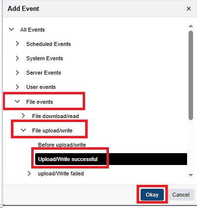 You can create a file upload event by configuring an "Upload" event type in Titan MFT Server's Events section, which allows you to trigger actions automatically when files are uploaded.