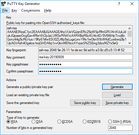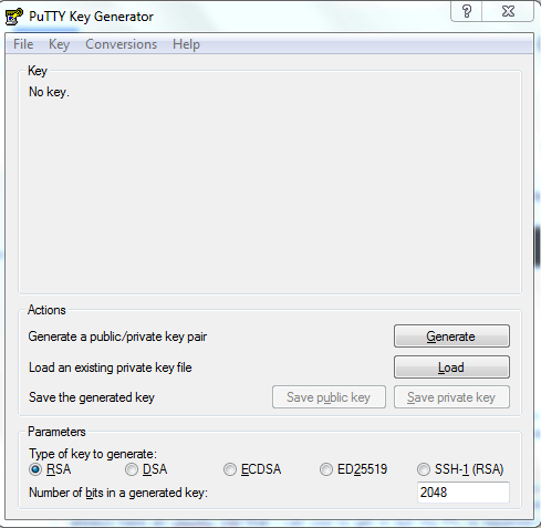 After the programs are installed, start the PuTTYgen program through your Start Menu or by tapping the Windows key and typing puttygen. The key generation program looks similar to this: