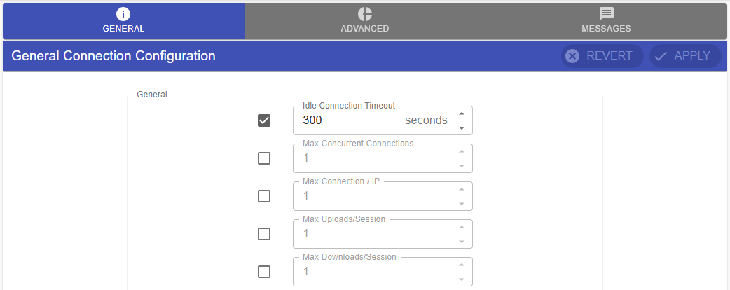 The Connections General tab is used to configure general connection settings. These values can be set at the Server, Groups, and User level.