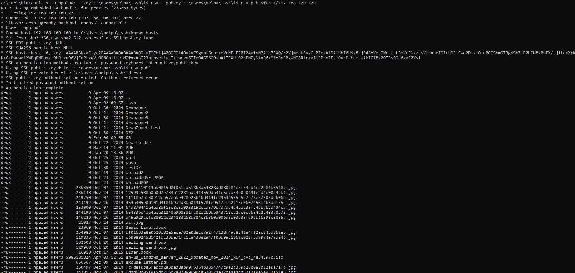 c:\curl\bin>curl -v -u npalad: --key c:\users\nelpa\.ssh\id_rsa --pubkey c:\users\nelpa\.ssh\id_rsa.pub sftp://192.168.100.109
