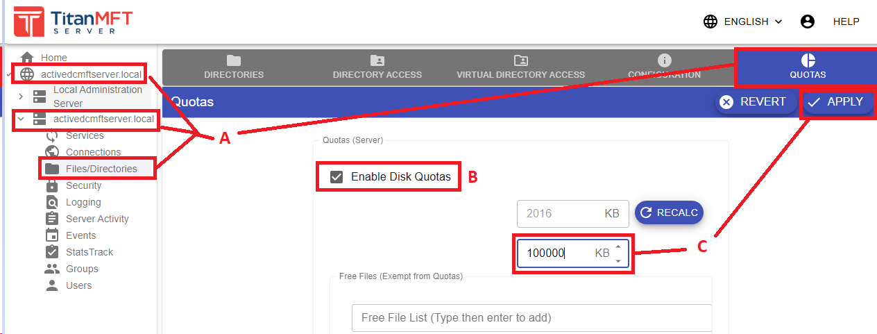 - Navigate to Domain > Server > Files/Directories. From there select QUOTAS tab