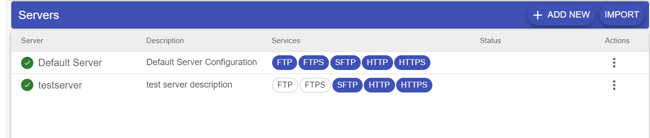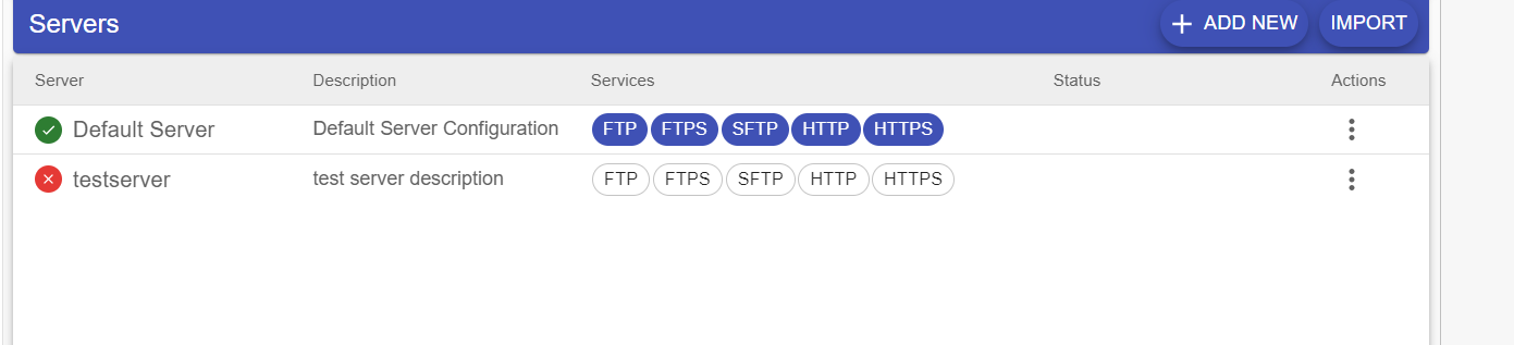 - Once the import has completed, the server will appear in the list with either a red icon (imported but not running) or a green icon (imported and running)