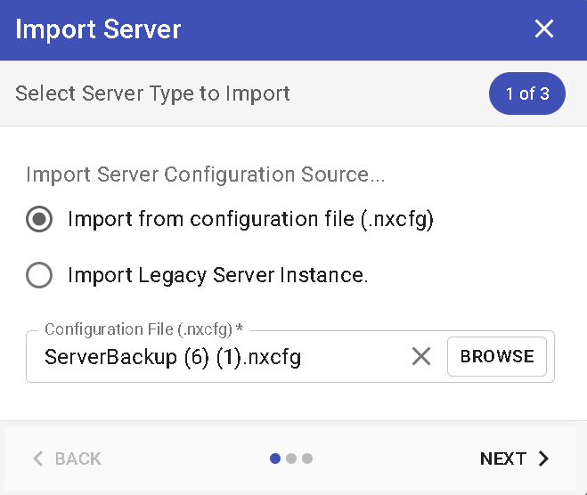 - Select Server Type to import, choose Import from configuration file (.nxcfg) > click Browse, choose your backup > click Next
