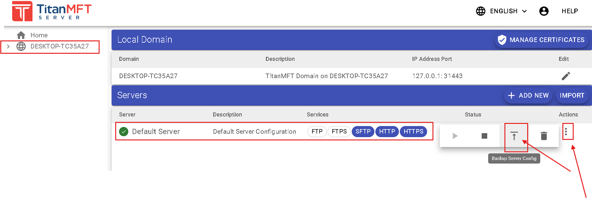 - Navigate to Domain > Under Servers, below the Action column, click the 3 vertical dots > click Backup Server Config.