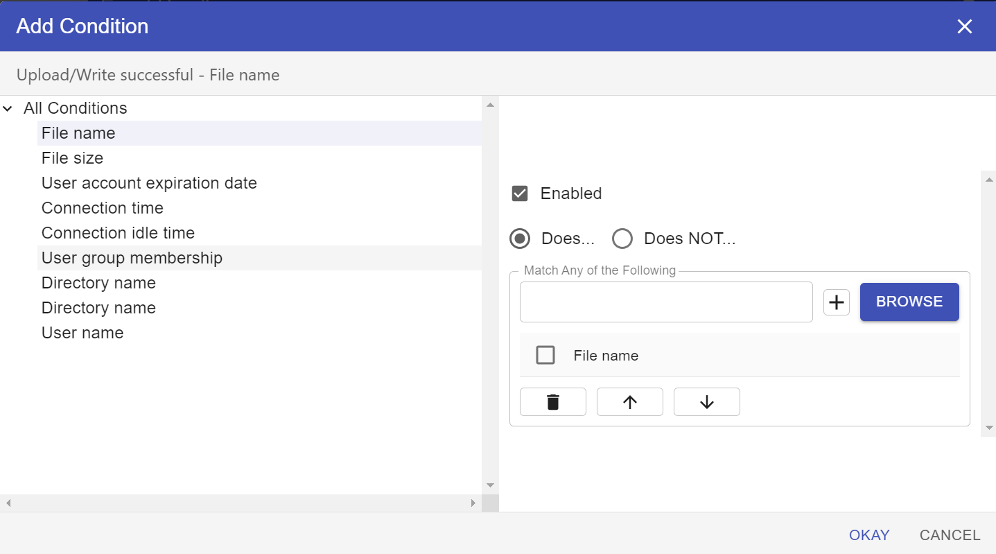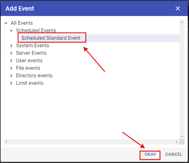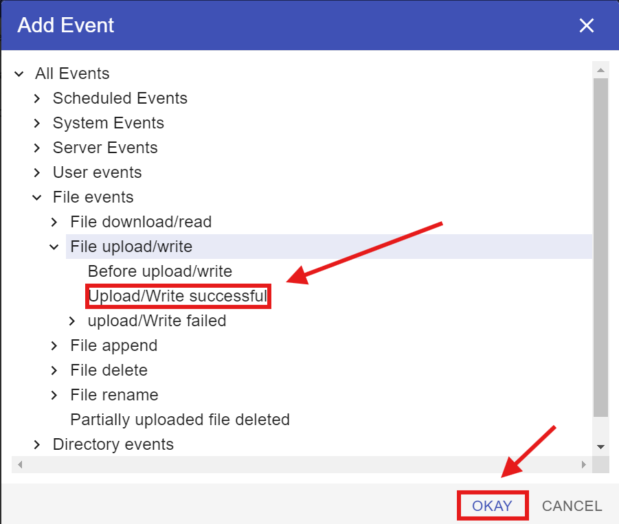 - Navigate to File Events > File Upload/Write > click Upload/Write successful > click Okay