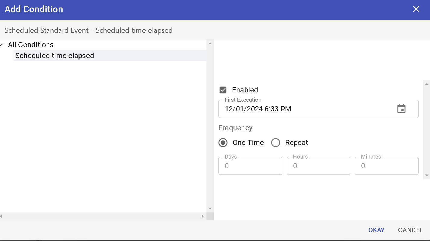 - Choose an option whether you want your event to run One Time or on Repeat (if this otion is chosen, choose the corresponding Days, Hous, and Minutes to repeat ), then click OKAY.